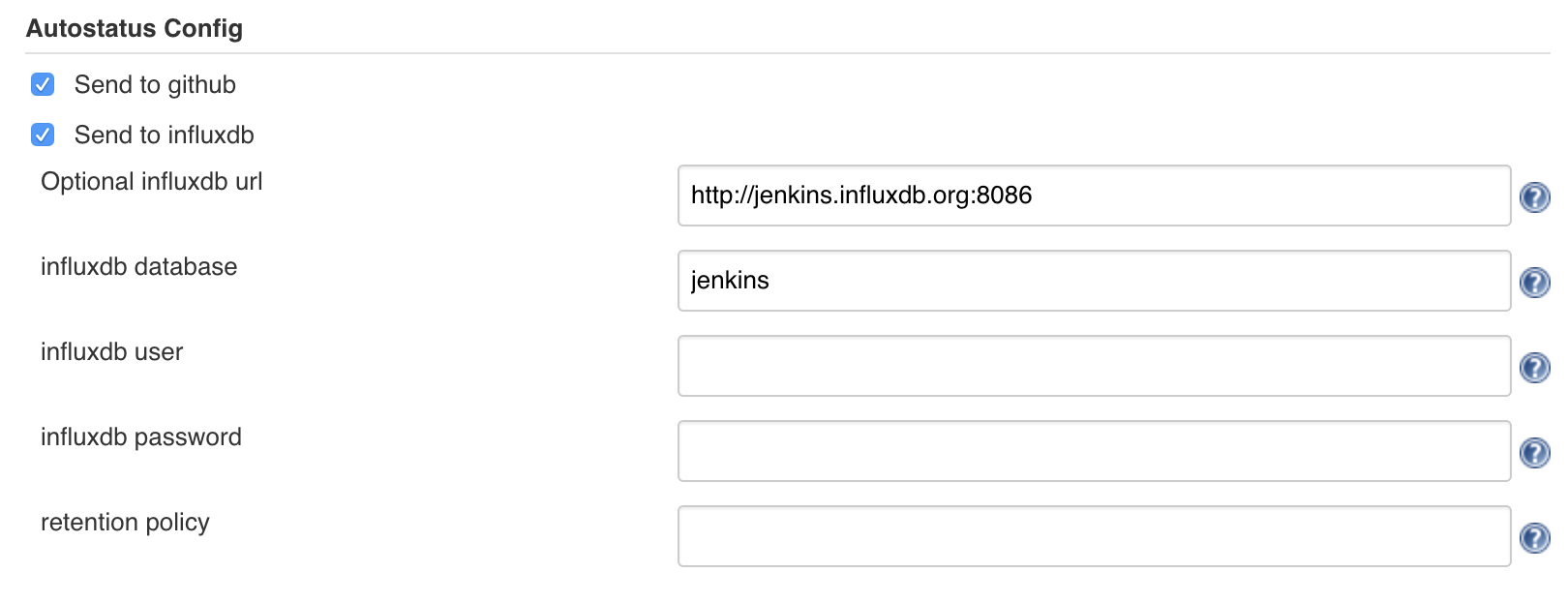 By default, the plugin only provides status to Github. To enable reporting stats to InfluxDB for the Grafana dashboards: