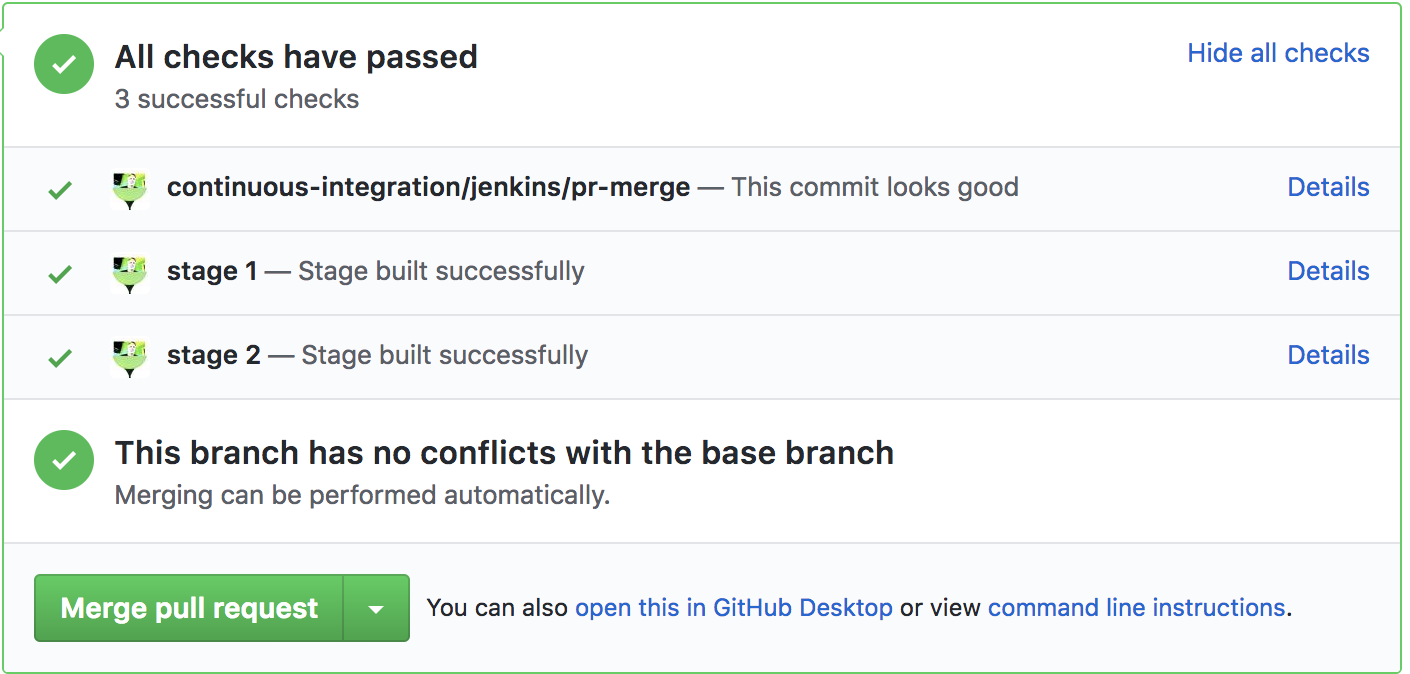 As each step is completed, the status will change to completed or error, depending on the outcome of the stage. At the end of a successful build, the PR page will show the following: