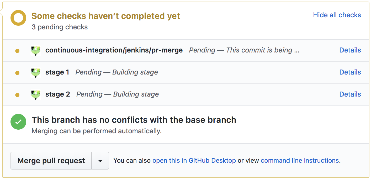 The plugin can be configured to send commit status for each stage for jobs built from a multibranch project. The GitHub page for the commit will initially show pending for each stage: