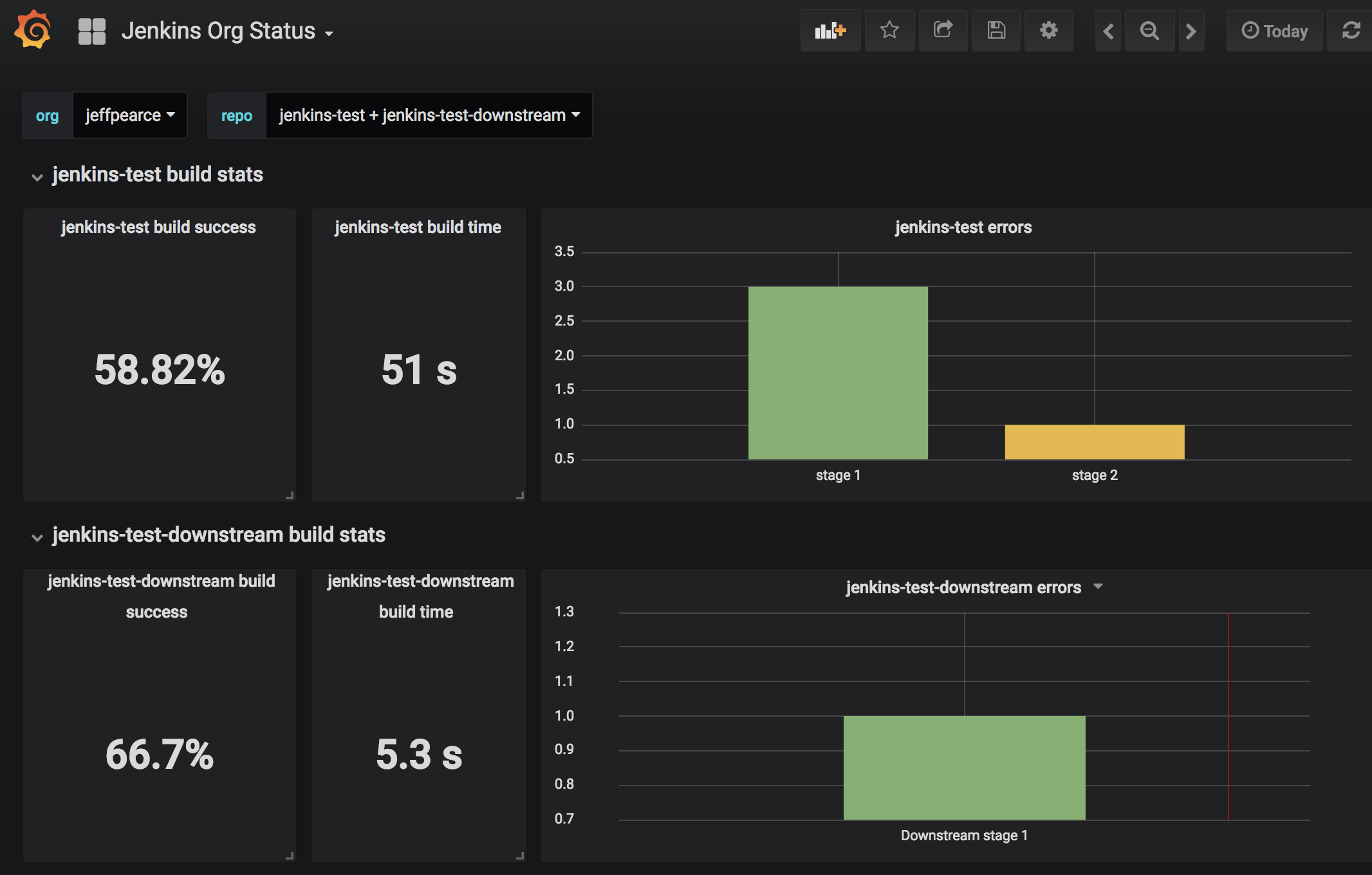 The sample dashboard is just a starting point to demonstrate how the InfluxDB stats can be used to build dashboards. You can create dashboards that show more detailed information, such as graphs of build health over time. I'll continue to publish additional samples to Grafana.com as time permits.