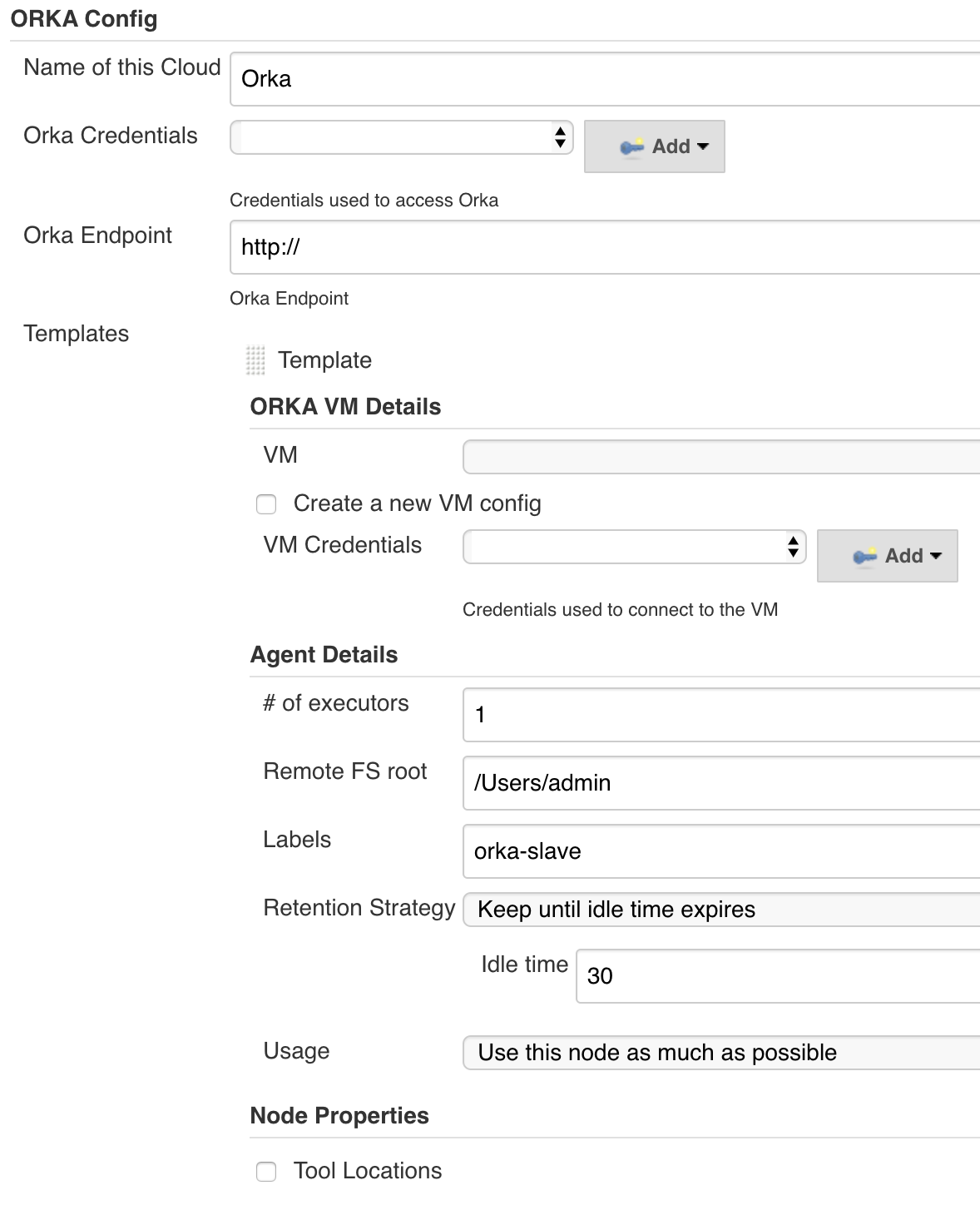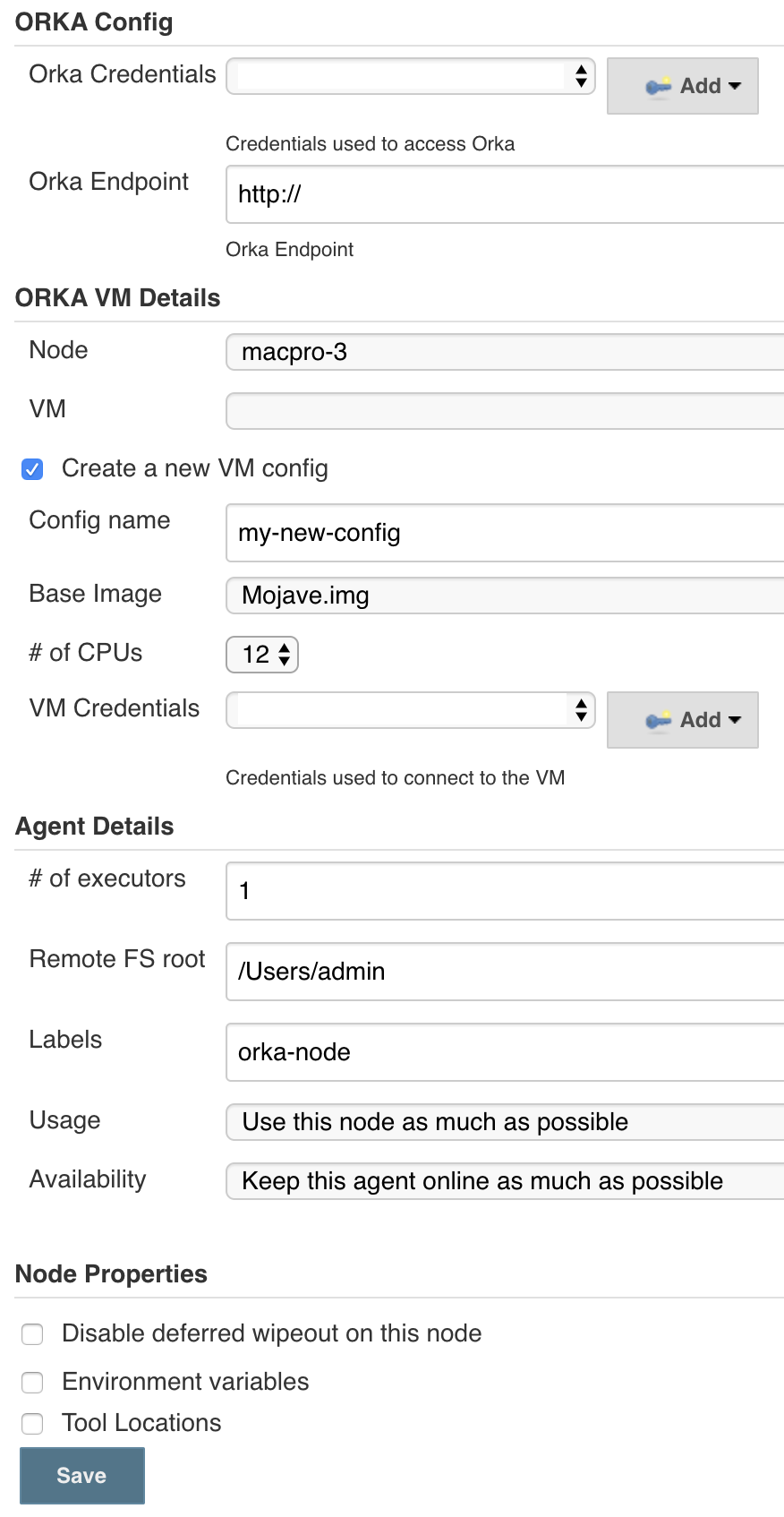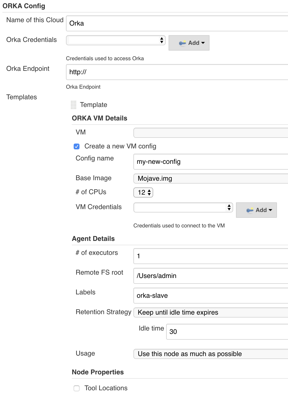 Advancedto configure also:- Max Jenkins Agents Limit - The maximum number of Orka VMs that can be created by that cloud instance. This allows you to better manage your Orka resources.
